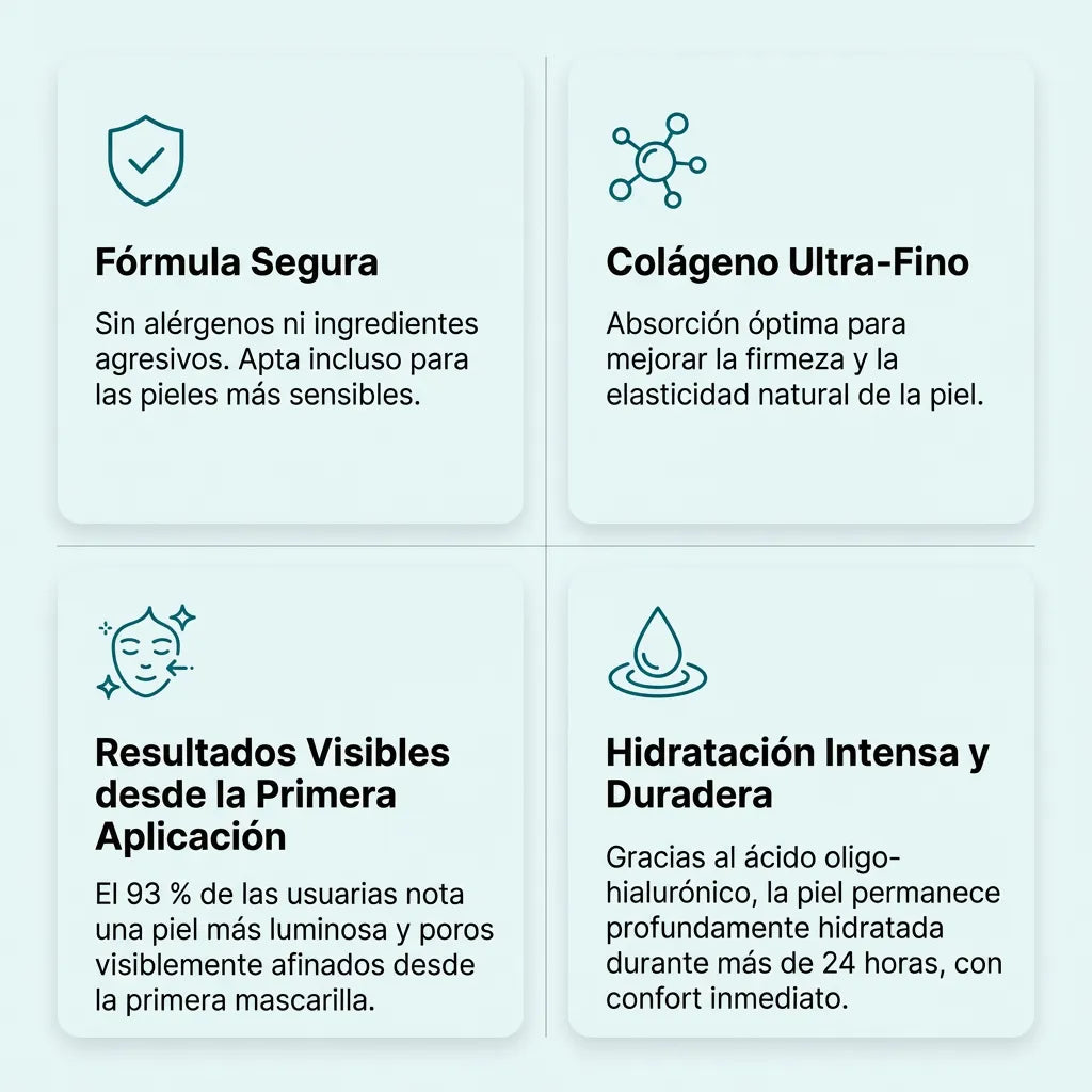 Una mascarilla de colágeno es un tratamiento facial diseñado para hidratar intensamente , iluminar la piel y reducir la aparición de manchas y líneas de expresión gracias a su alta concentración de colágeno.
