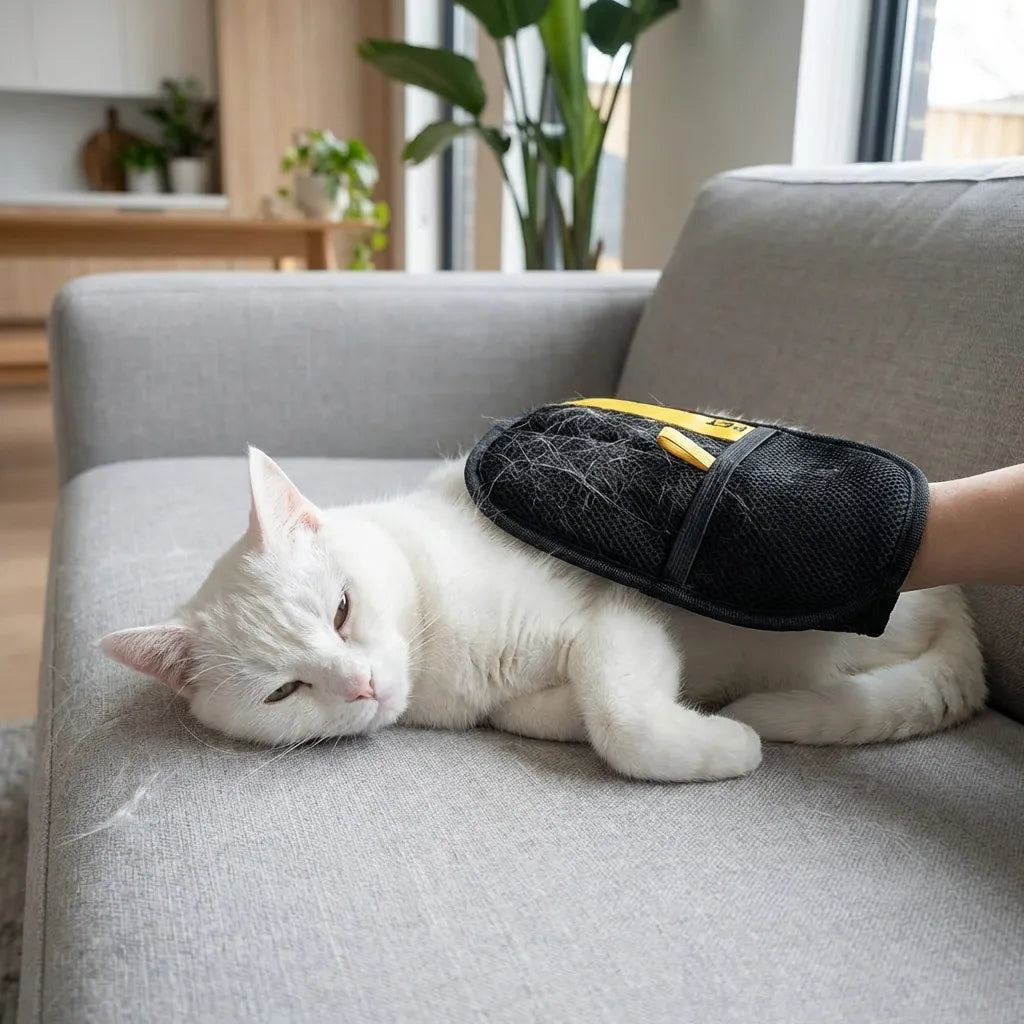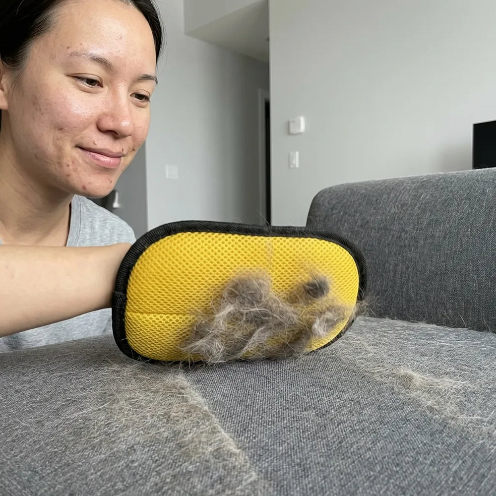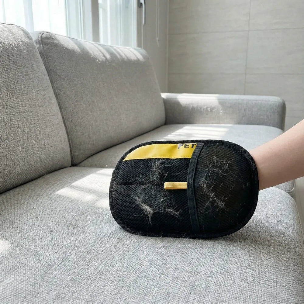 1. Pasa el guante por la superficie → el pelo se queda adherido.